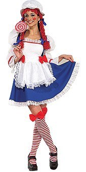 Rag Doll Costume includes short blue dress with white lace trim, apron with lace detailing and red bows, and hat with attached yarn ragdoll hair.