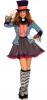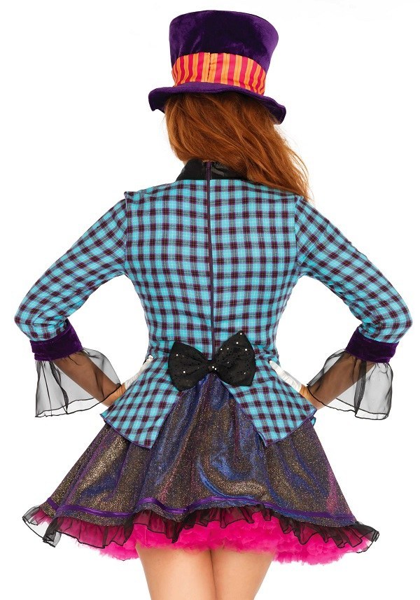 Ravishing Mad Hatter Costume includes a multi print dress with a glitter skirt with a black trim. The dress also features an attached clock neck piece.
