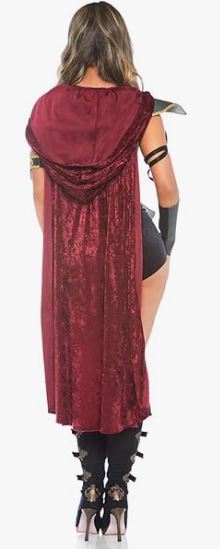The costume features a green fitted top with gold trim detailing, paired with a dramatic red hooded cape for an authentic outlaw look. Finished with a wide belt and arm accessories, this outfit creates a striking Robin Hood-inspired appearance.