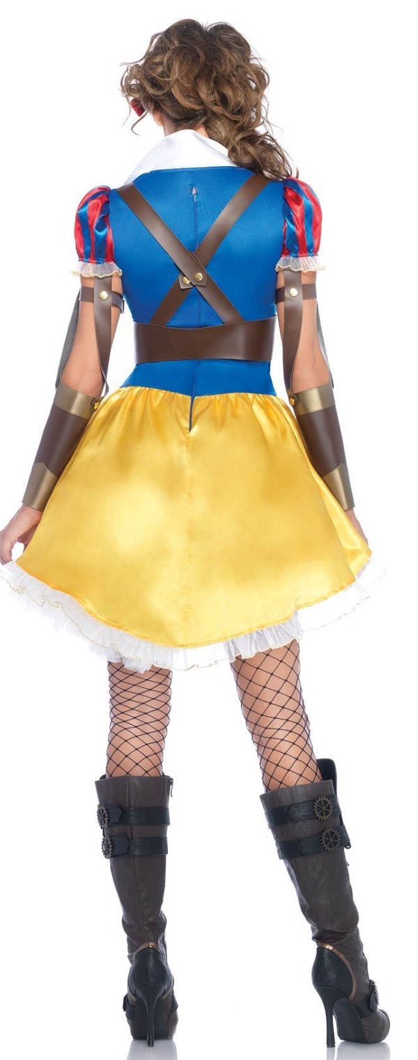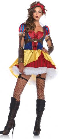 A unique and exciting take on this fairytale character the Rebel Snow White Costume includes high/low dress with lace up bodice and attached faux leather arm cuffs, adjustable body harness, and matching bow headband.