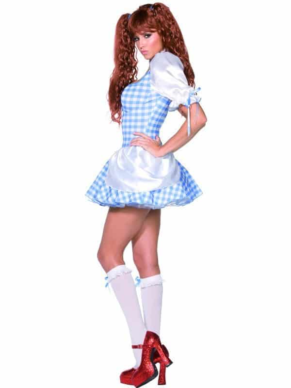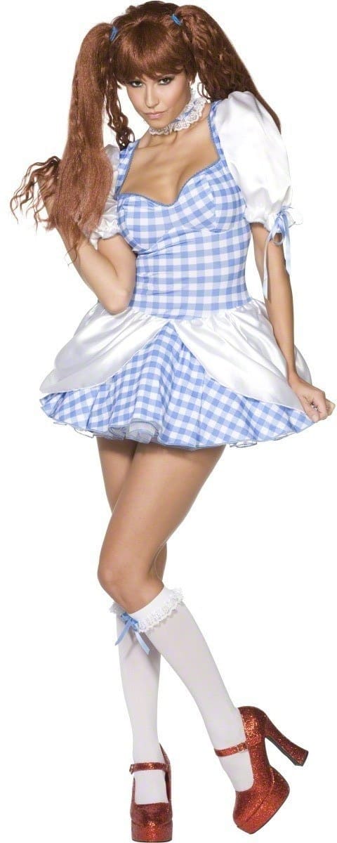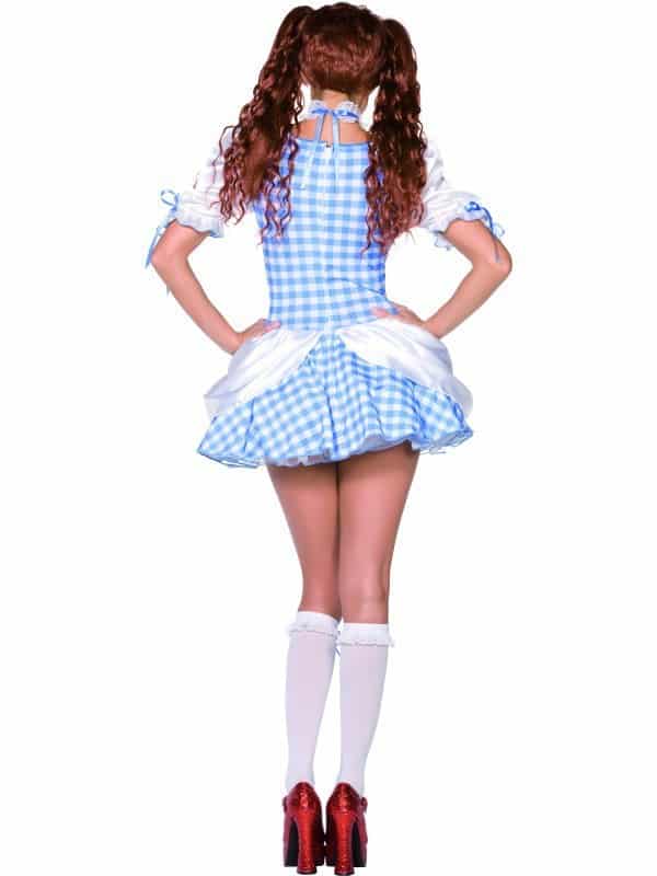 Rebel Toons Dorothy costume includes a blue and white checkered dress with silk attachments to skirt and sleeves. Dress also comes with an attached petticoat underneath skirt and zip closure at the back of dress.
