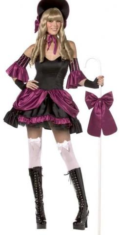 Rebel Toons Little Bo Peep costume includes a black and purple corset style thin strapped dress with attached black petticoat and black bow at the back. Costume also includes a matching bonnet with bow, black glovelettes and a pair of detached sleeve puffs.