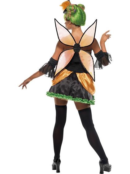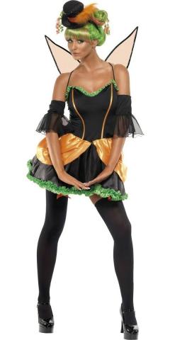 Fever Pumpkin Fairy costume includes a black, orange and light-green mini dress with a zip at the back to close, a pair of black sleeves and black and orange wings. To complete the look the costume also includes black stockings with an orange bow at the knee and small black hat with orange feather which is attached to a black hair band to keep it in place.
