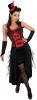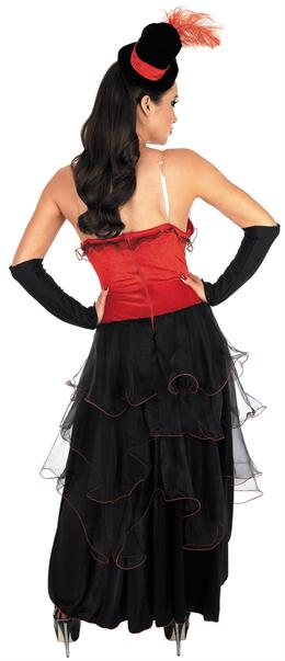 Our Red Burlesque Dancer costume consists of a red and black corset long dress with bow and mesh detailing. The top of the dress is velour and features a short black skirt at the front and long black layered skirt with red trim to the back.