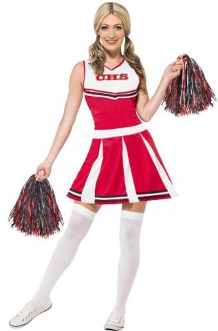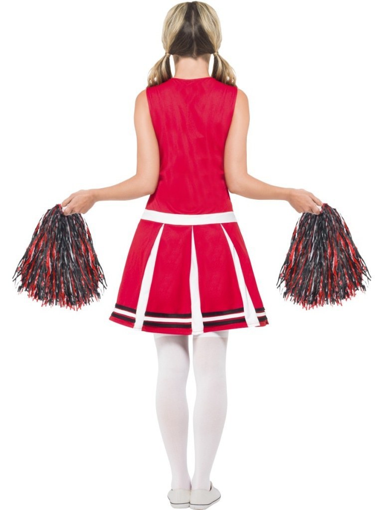 Red Cheerleader costume includes a red, white and black Cheerleader dress with "CHS" print. To complete the look a pair of pom poms are also included.