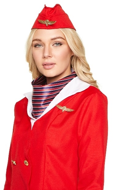 This high flying costume also includes a shirt insert and a necktie. To complete the look a air hostess hat with badge is also included.