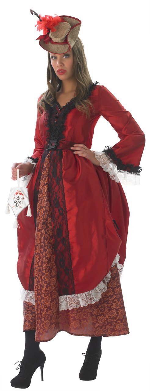 Deluxe Adult Red Harrington costume includes red dress with bustle, mini hat and handbag. Ideal for any wild west or cowboy themed nights.