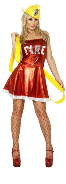 Red Hot Stuff Fire Fighter Costume includes a metallic effect red dress with 'fire' written on the front in silver and attached yellow braces.
