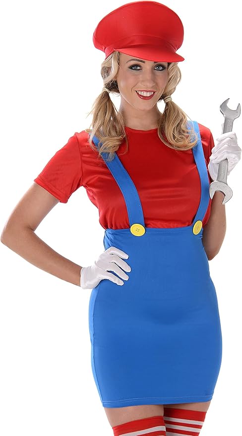 This Red Plumber Girl Costume comes with a dress, t-shirt, hat, and stockings—perfect for jumping on Goombas, rescuing yourself, or just ruling the party with pixel-perfect style.