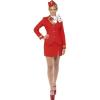 Red Trolley Dolly Costume includes a bright red jacket with gold trim on the collar and cuffs and gold buttons, a matching skirt with small slit to one side, matching hat with gold plane detail and a pretty white scarf with polka dot and plane prints.