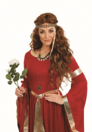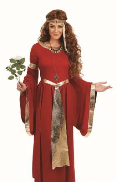 Lady Renaissance Costume includes a red dress with gold detailing and a gold attached belt.