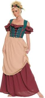 Renaissance Maid Costume consists of a Long off the shoulder burgundy dress and a green bodice with pink detail and lace up closure. Also includes beige skirt apron and a headband to match the dress.