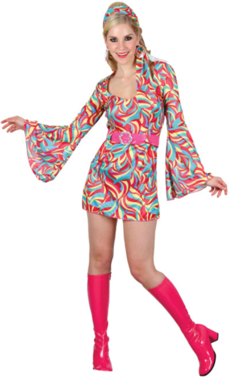This ladies Retro Go Go Girl costume includes a colourful multicolour print mini dress with flared sleeves and a pink belt with silver flower buckle.