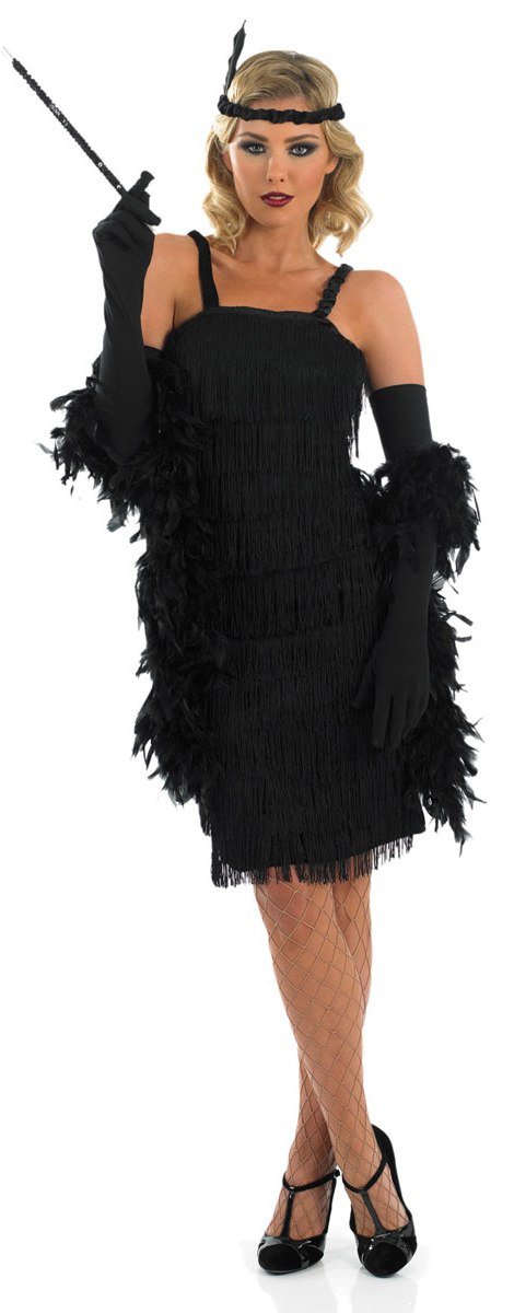 Roaring 20's Ladies Costume is a fabulous faux velour dress with flirty fringe detail on the front, also included are a pair of long gloves and a headband with attached feather.