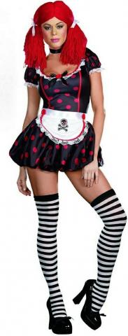 Rockin’ Ragdolly Costume includes a black with red polka dot microfiber dress with lace trimmed on both the sleeves and scoop neckline. This short sassy dress has bubble style hemline and white apron with skull print and button details.