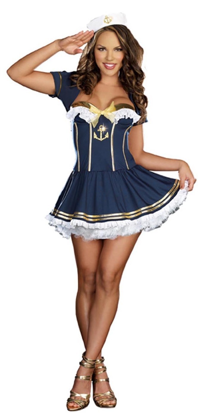 This Sailor Rockin' the Boat Adult Costume includes a pin-up corset styled dress, with a matching shrug and a sailor hat. This sexy sailor costume is sure to make a splash at your next costume party!