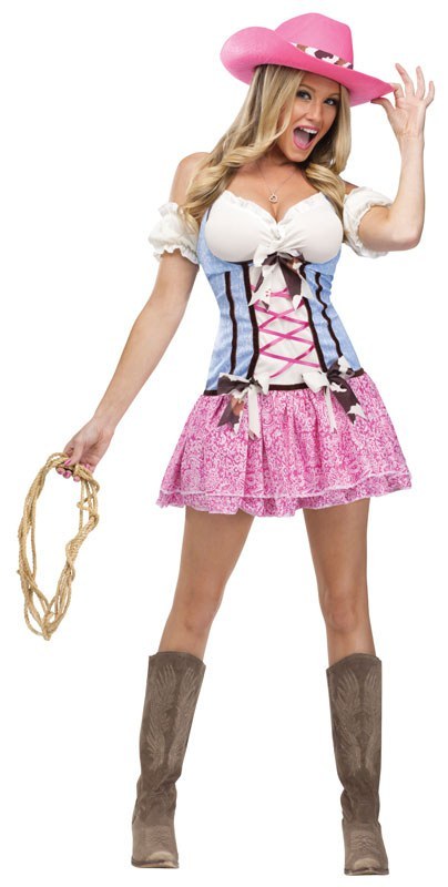 Howdy Partner! Join the western fun with this cute and excellent Rodeo Sweetie costume. The costume features an halter neck dress in blue, white and pink. The dress has a blue corset style top with pink tie up design. There is an attached pink short skirt with bows. The dress also includes white off the shoulder puff sleeves. To complete your Rodeo Sweetie look there is also a classic pink cowgirl hat.