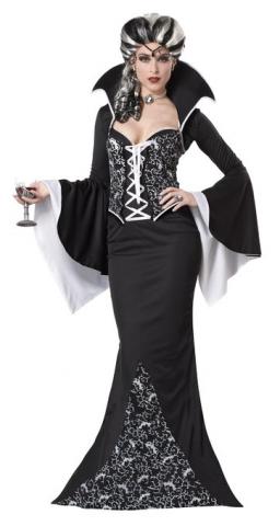 Our Royal Vampiress costume consists of a long black elegant fish tail dress with baroque style detailing throughout. Also includes is a black bolero with an oversized collar and long flowing sleeves.