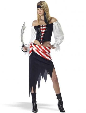 Ruby The Pirate Beauty includes a black skirt with jagged end and elasticated waist, black corset style mini top with red and white stripe insert and white puff sleeves, also includes red and white striped sash and black headband.