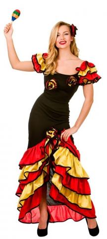 Rumba Dancer costume includes a black dress with red and yellow ruffles along the sleeves and bottom of dress. To complete the look a flower hair clip is also included.