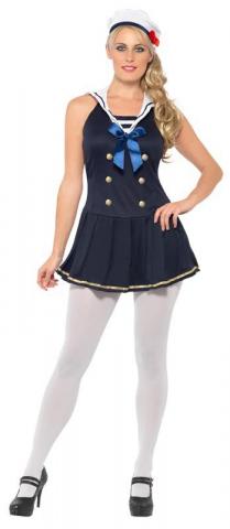 Our Sailor Cutie Costume includes navy nautical dress with gold detail trimming and buttons. The dress also includes blue ribbon bow tie to the front and white a blue sailor collar to the back.