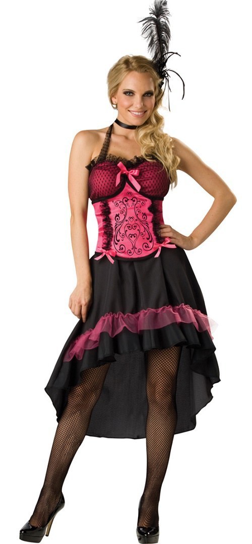 Deluxe quality Saloon Gal costume includes a pink and black dress and an adjustable corset. Perfect for a Moulin Rouge or wild west theme night.