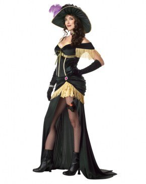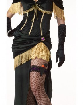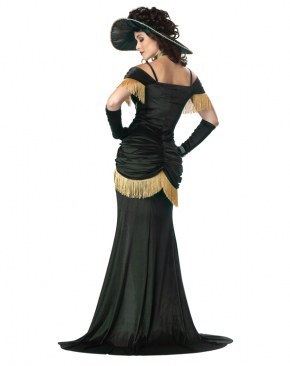Saloon Madame costume includes an off the shoulder dark green dress with a sweetheart neckline and fringe detailing. The dress with short and ruched at the front and long at the back. The dress also features lace detailing on the skirt and a purple jewel.