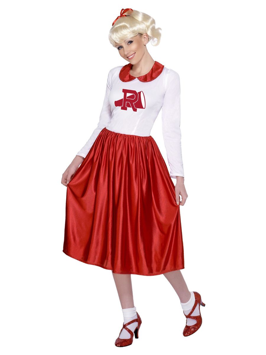Sandy Cheerleader Costume includes a white long sleeved top with red collar and attached shimmering red calf length skirt.