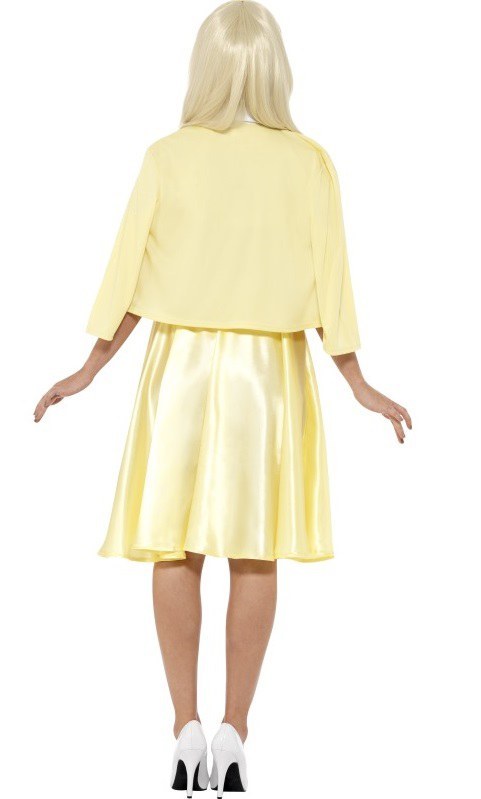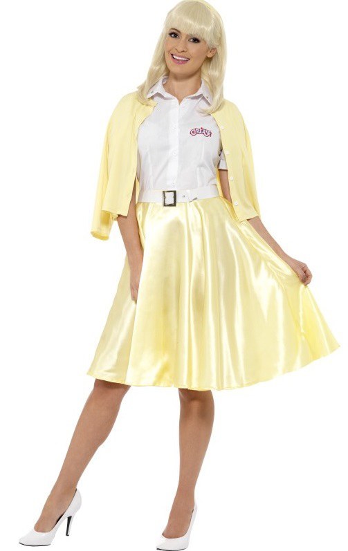Grease Good Sandy Costume includes a white shirt with yellow mock cardigan. Also included is a yellow skirt and belt. To complete the look a yellow headband is also included.