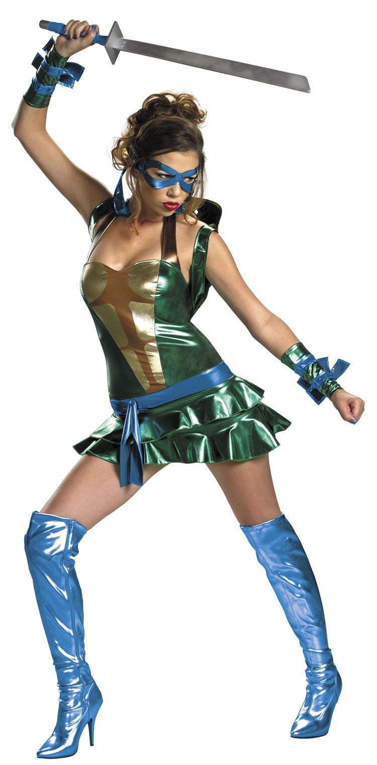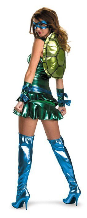 This sassy Leonardo costume features turtle shell mini ruffle halter dress with attached faux blue belt which sits on your waist. Also included is a blue eye mask which closure to the back for a secure fit and two green wristbands with attached blue ribbon.