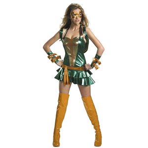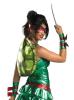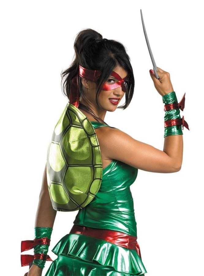Our sassy Raphael costume features turtle shell mini ruffle halter dress with attached faux red belt. Also included is a red eye mask with closure to the back for a secure fit and two green wristbands with attached red ribbon.