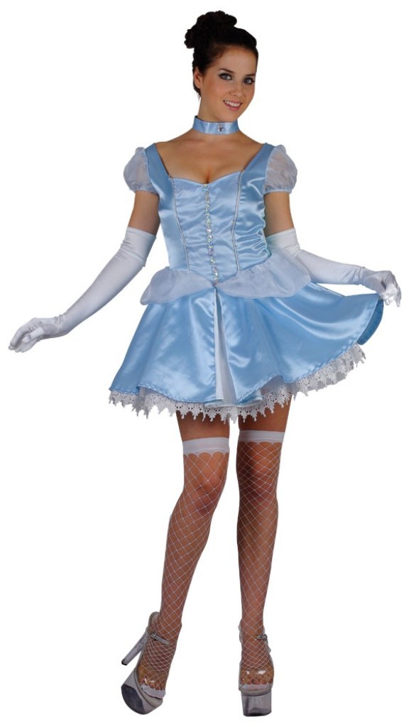 Saucy Cinders Costume includes a short blue satin feel dress with white insert and mesh detailing throughout. The dress also features and attached white lace petticoat to add volume to the skirt. Also included in this fairytale look is a blue choker with jewel.