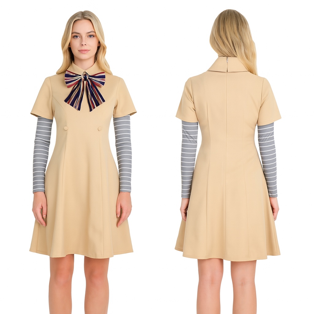 This Scary Doll Character Costume for ladies includes a beige dress, white tights, a striped bow tie and grey pattern detached sleeves.