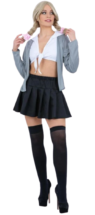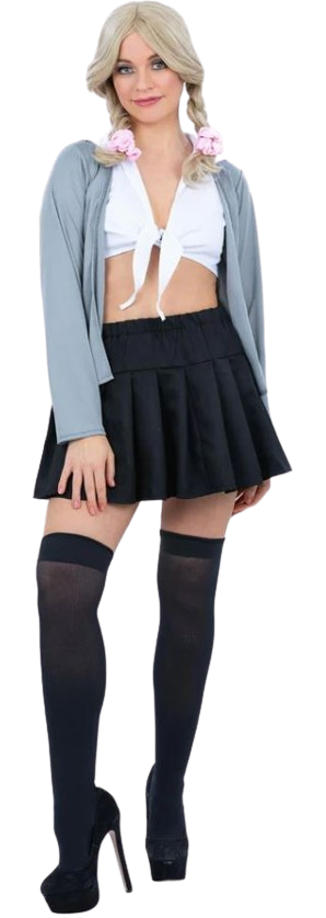Ace the style test with this classic schoolgirl costume. This all-in-one outfit includes a crisp shirt with an attached cardigan, a skirt for maximum twirl factor, and matching hair scrunchies to tie it all together.