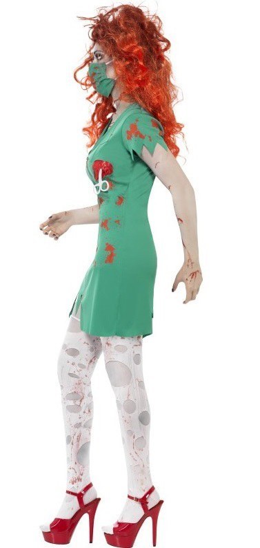Scrub Nurse costume, a classic green scrub dress with a white attached mock apron, elasticated waist and white collar and cuffs.