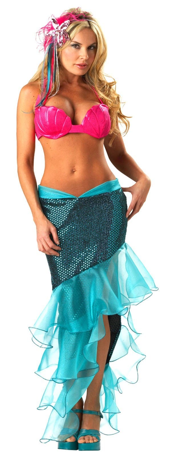 Sea Goddess Costume includes a shimmering pink shell bra top, turquoise sequin skirt with ruffled organza fin, plus sequin starfish headpiece.