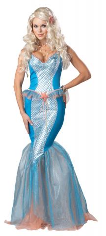 Sea Siren costume includes a long blue and white mermaid style dress with a low neckline and a tutu style fin. The dress also features a starfish badge and pink ribbons. To complete this pretty look a starfish hair clip is also included.