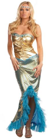 Sea Worthy Mermaid Costume includes a stretch gold foil and shell print shirred front gown with metallic fishnet ruffled hemline. Costume also feature plastic collapsible trim inserted in hem creates mermaid fish tail shape.