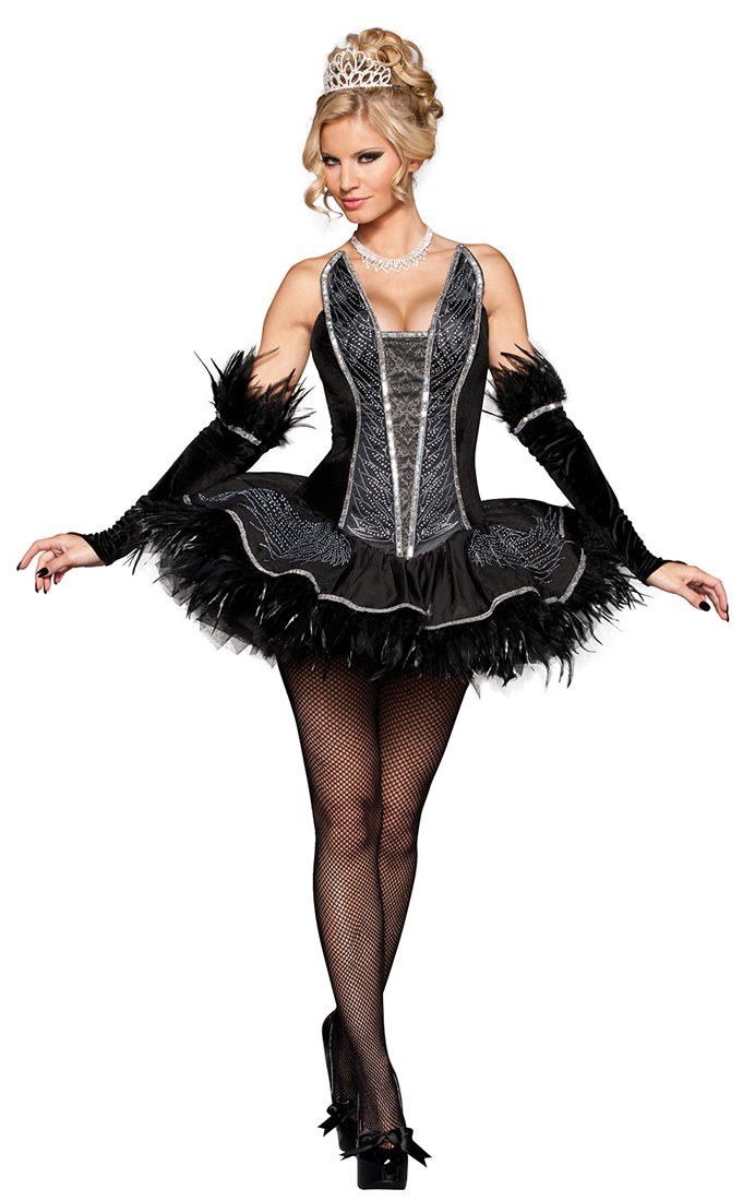 The very beautiful Seductive Swan Ladies Adult Costume includes a black faux velvet and satin dress with corset-like boning, sequin and rhinestone accents and black feather trim. Also included to complete the look is a petticoat tutu and matching velvet modesty pants, opera length velvet glovettes with sequin, feather trim and rhinestone tiara. Please note: (Jewellery and fishnet stockings not included but similar may be purchased separately)