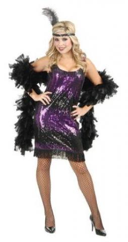 The Sequin Flapper Costume consists of a mini-dress designed with purple/black, red/black or jade/black sequins and layers of black fringe on the dress hem.