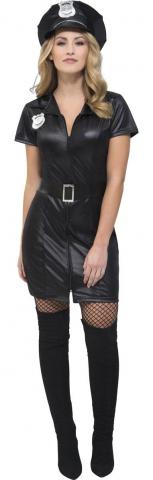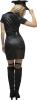 Sexy Cop costume consists of a black wet look stretchy fitted dress with zip up front and attached police badge detail. Also includes buckled belt and hat to match the dress.