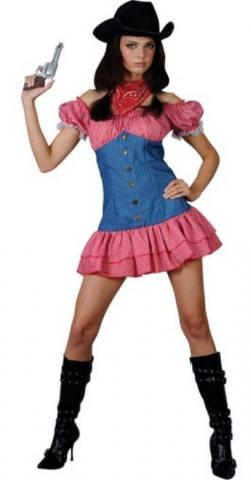 The Sexy Cowgirl Costume includes a pretty pink and blue cowgirl dress with short lace trim sleeves and bronze buttons up front. For a complete cowgirl look, the costume also comes with a matching red bandana.