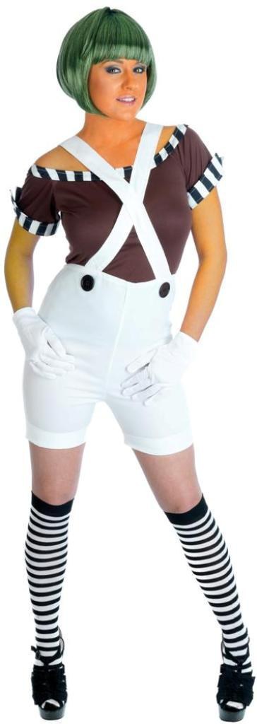 The Sexy Factory Worker Costume includes a wide neck brown top and white short dungarees. Also included in the costume is a pair of black and white knee length socks and a pair of white gloves.