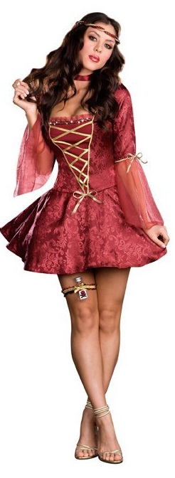 Sexy Juliet costume includes a burgundy jacquard dress with gold lace up bodice and bow Trim. Costume also includes a braided headpiece with chiffon veil, choker and garter with poison bottle.