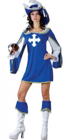Sexy Musketeer Costume includes a short blue dress with gold trim, bell sleeves and a printed white cross at front. The costume also comes with a deluxe blue and white hat and boot tops to complete the sexy musketeer look.
