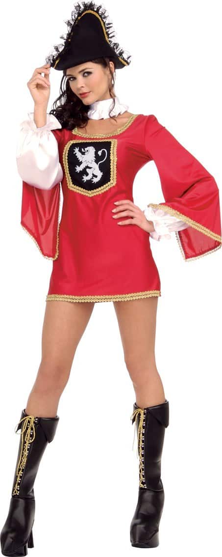 Sexy Musketeer Costume includes a short red dress with gold trim and lion insignia, bell sleeves and costume includes black hat.