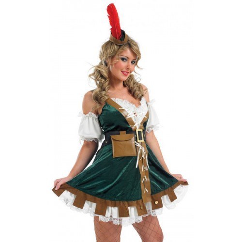 Steal hearts as the Sexy Robin Hood costume. This cute costume includes green pinafor style dress with brown faux leather detailing and white ruffle bodice shirt with co-ordinating puff sleeves, the black belt with brown pouch sits around the waist.