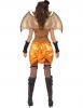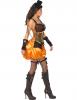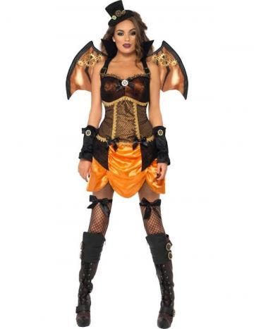 The unusual Sexy Steampunk Bat costume includes a black and gold fitted hi collared top with buckles, cogs, black lace and ribbon detailing. The orange skirt has gathered effect with bustle style at the back and lace detailing on the front.