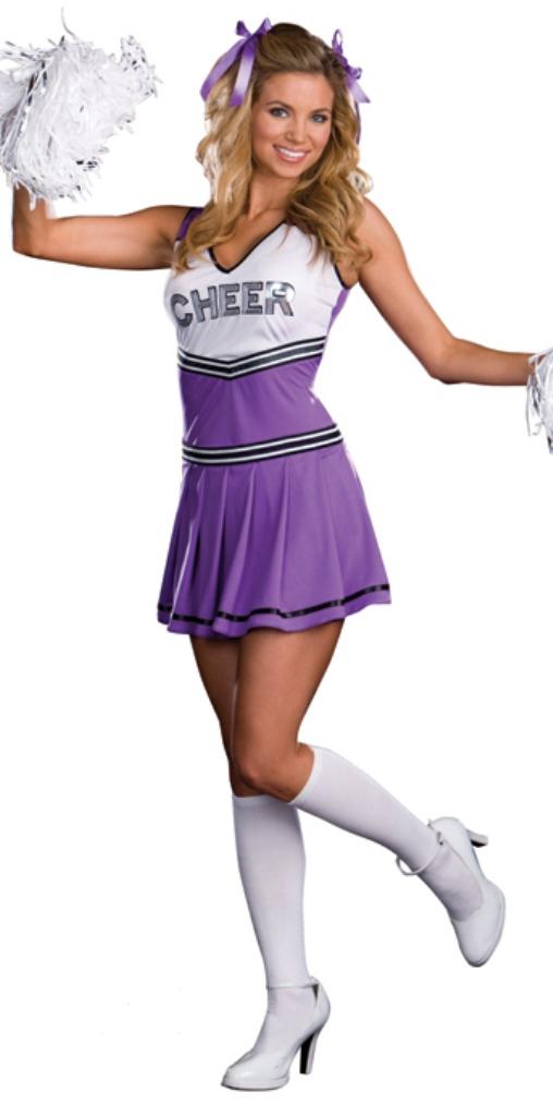 Cheer for your favourite team in our Sideline Spirit costume. This pretty costume includes a white and purple dress with " cheer" printed on the top and black and white stripe detailing. Also included is a pair of purple hair ribbons.