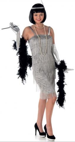 Flapper Girl Costume includes a silver fringed dress with sequin straps and a pair of gloves. Costume also includes a silver sequin headband with feather.